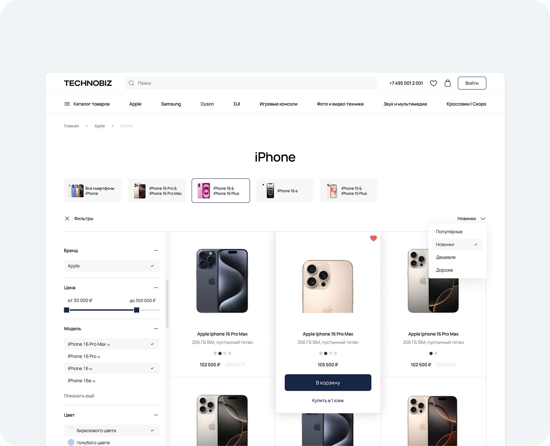- Каталог товаров, поиск, карточка товара с фильтрацией и сортировкой